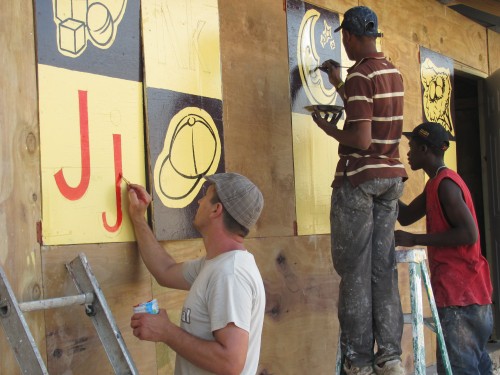 Martin Blanchard (à gauche) qui possède une entreprise d’affiches commerciales, a donné naissance à ce projet de peinture. Les 5 classes comptent 26 volets et l’alphabet compte 26 lettres, un volet pour chaque lettre!