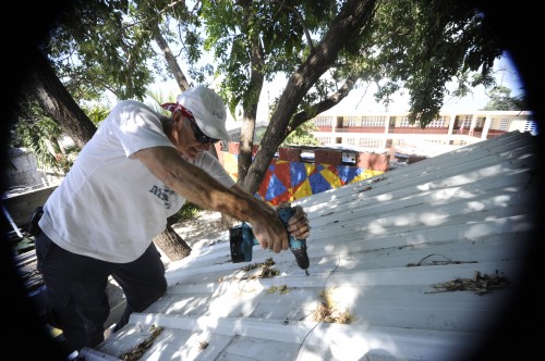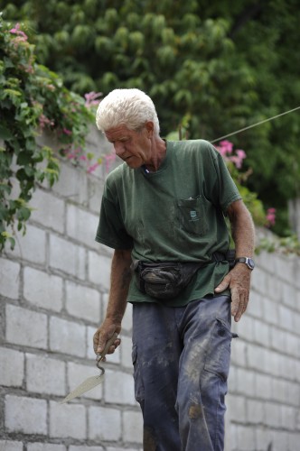 L’électricité : Dan fixant un spot à l’extérieur de l’église.