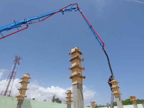 Le camion pompe déverse le ciment dans les colonnes du 3e plancher.