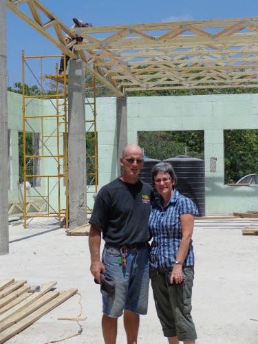 M. Jean-Charles Pelletier, de Ste-Foy, Québec, qui a construit plus de la moitié de nos bancs et pupitres d’école et fait les coffrages des colonnes, est revenu pour construire la toiture. Le travail est énorme et il n’est pas terminé. Il est ici en compagnie de son épouse Jacinthe.