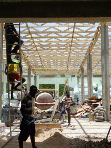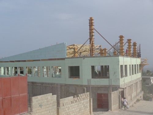 Dans le but d’enlever du poids sur le building, une petite partie de la toiture est faite de béton et le reste sera fait de tôles. Ces poteaux de fer soutiennent la dalle de béton pour 21 jours, soit le temps qu’elle durcisse complètement.