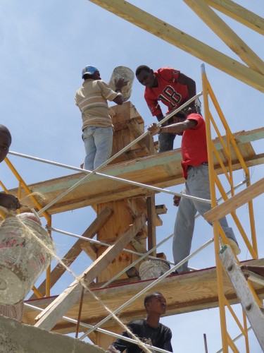 Coulage des colonnes à la main. Les seaux remplis de béton, sont montés dans l’échelle et passés d’une main à l’autre.