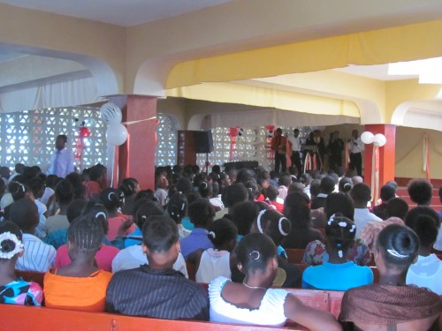 L’équipe de Mme Francine Pagé (centre avant) est venue faire écrire les lettres des quelque 650 enfants parrainés à leurs sponsors. Le pasteur Benoît Marcoux de Victoriaville (2e rangée, au centre) les a accompagnés pour une semaine et en plus de prêcher, il a réparé tout ce qui cassait au bon moment. L’équipe a imprimé des certificats, fait de la classification, mis à jour des dossiers, traduit des lettres etc. Christelle (3e de la rangée arrière) étudiante en médecine, a fait passer des tests de la vue aux 800 enfants inscrits au programme. Quelle patience!