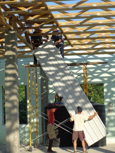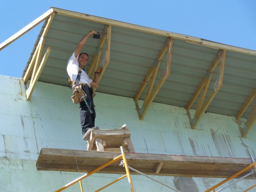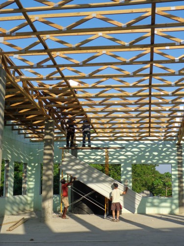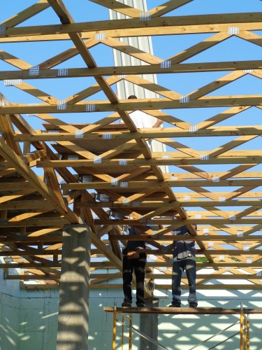 La construction de la toiture du 3e plancher faite de bois et de tôles.