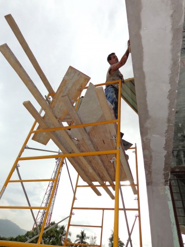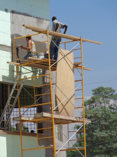 Le crépissage des murs de notre centre va bon train. Deux murs extérieurs sont terminés. Les jours de pluie que l’ouragan Sandy a laissés sur son passage ont contribué à faire avancer le crépissage des murs à l’intérieur du building. Bientôt, nous ferons la peinture des murs.