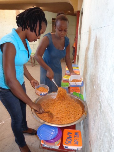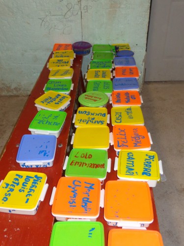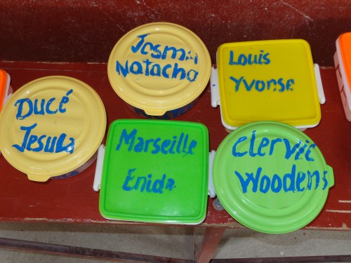 Nous avons recommencé à servir des repas de spaghetti à l’école. Chaque enfant a son plat marqué de son nom qu’il amène à la maison pour le laver et le ramener le lendemain à l’école.