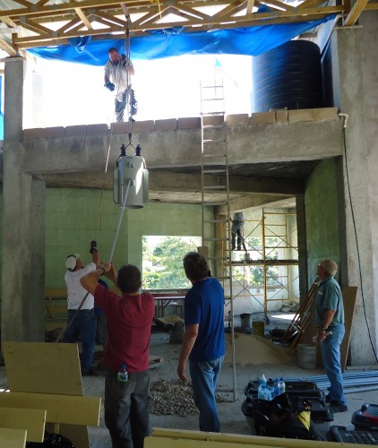Roy et les hommes montent le transformateur au 4e plancher à l’aide d’un système de poulie et de câbles.